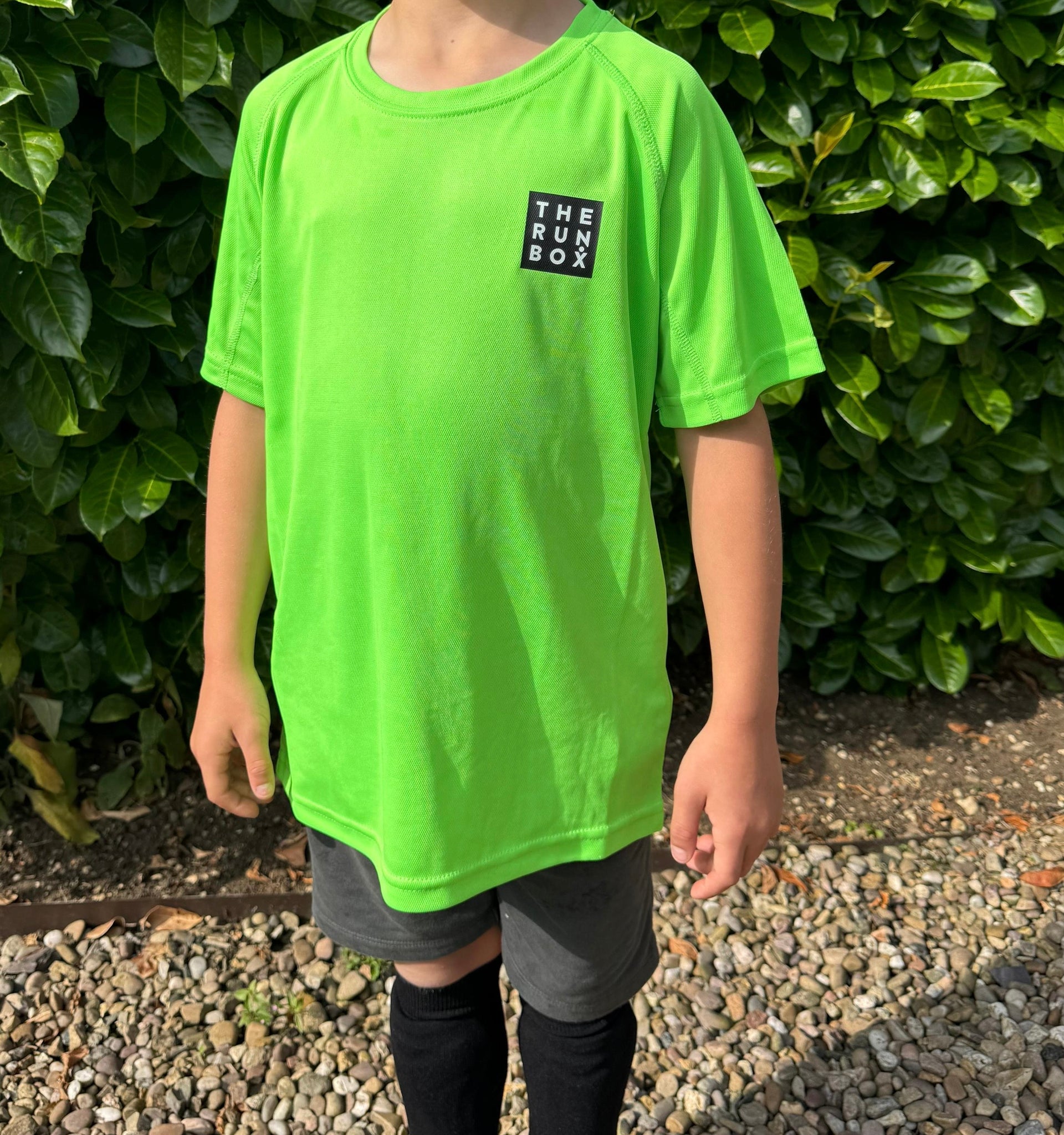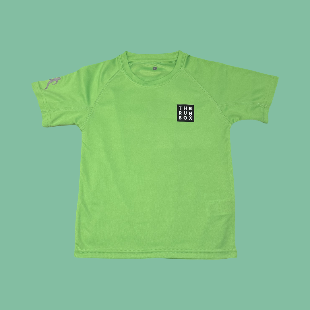 Aircool bright green running tee for kids with reflective running person icon on sleeve.